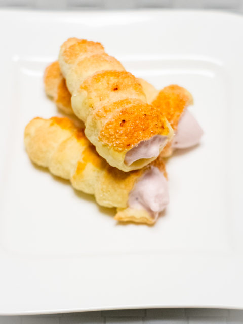 Lekkie , kruche rurki z półfrancuskiego ciasta śmietanowego. Wierzch posypany malinowym cukrem.…