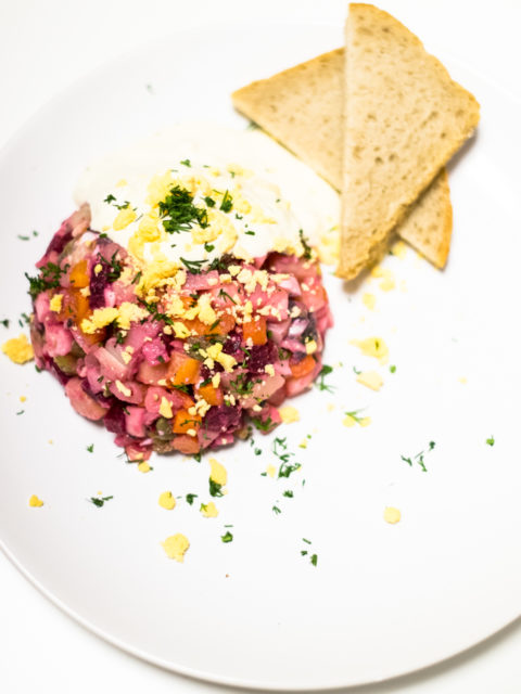 Dużo warzyw korzeniowych, buraczki, śledzie solone, korniszony, kapary, jajka i jabłko.…