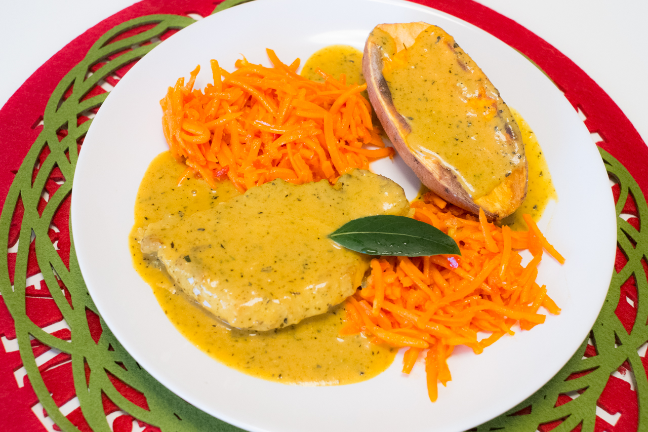 Schab w sosie jabłkowo-miętowym z pieczonym batatem i marchewką po koreańsku