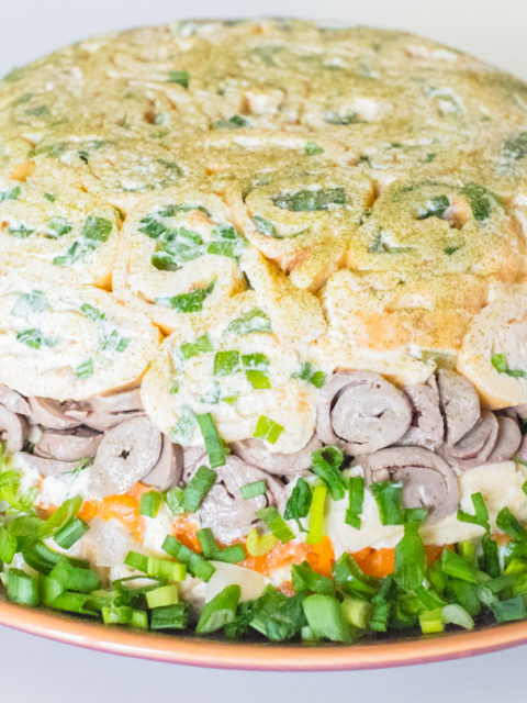 Ciekawa, warstwowa sałatka z dodatkiem gotowanych drobiowych serc. Prezentuje się pięknie i…