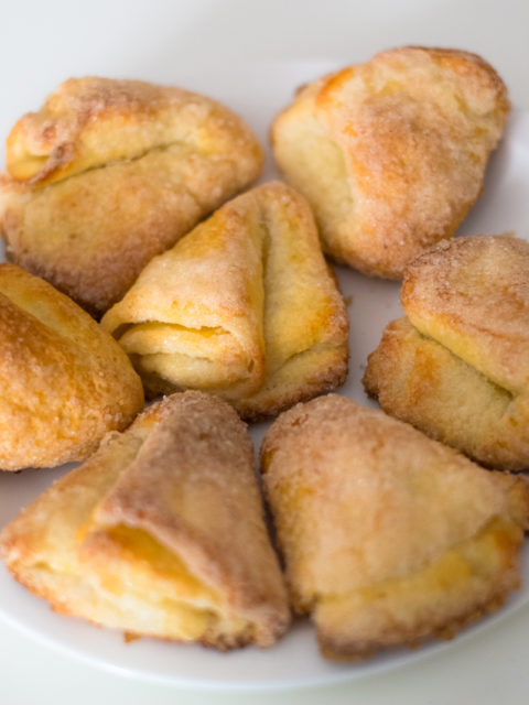 Proste, twarogowe ciasto złożone w trójkąciki i obsypane cukrem , ewentualnie cukrem…