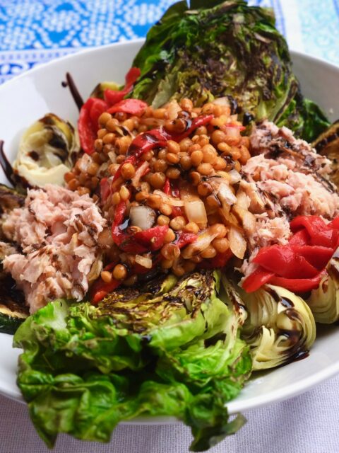 Sałata rzymska z patelni z soczewicą, tuńczykiem i innymi pysznymi warzywkami.