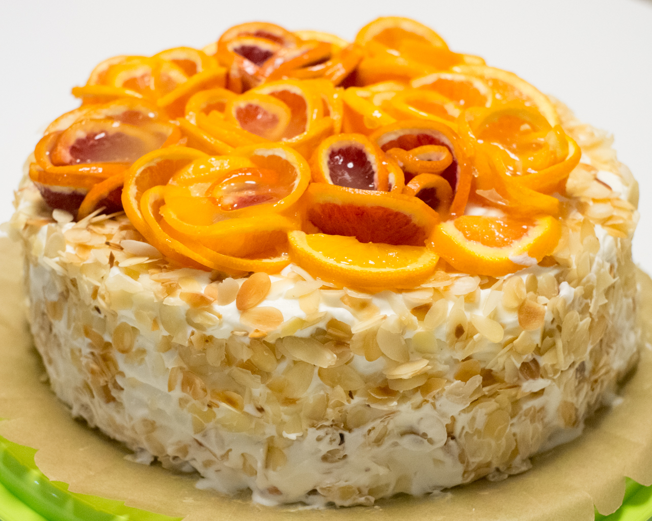 Podprażyć płatki migdałowe na suchej patelni. Ubić śmietankę z cukrem i posmarować nią wierzch i boki schłodzonego tortu ( wyciągniętego wcześniej z tortownicy). Na torcie ułożyć róże z plasterków pomarańczy. Boki obsypać migdałami i włożyć tort jeszcze na godzinę do lodówki.