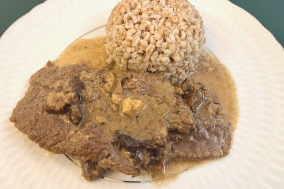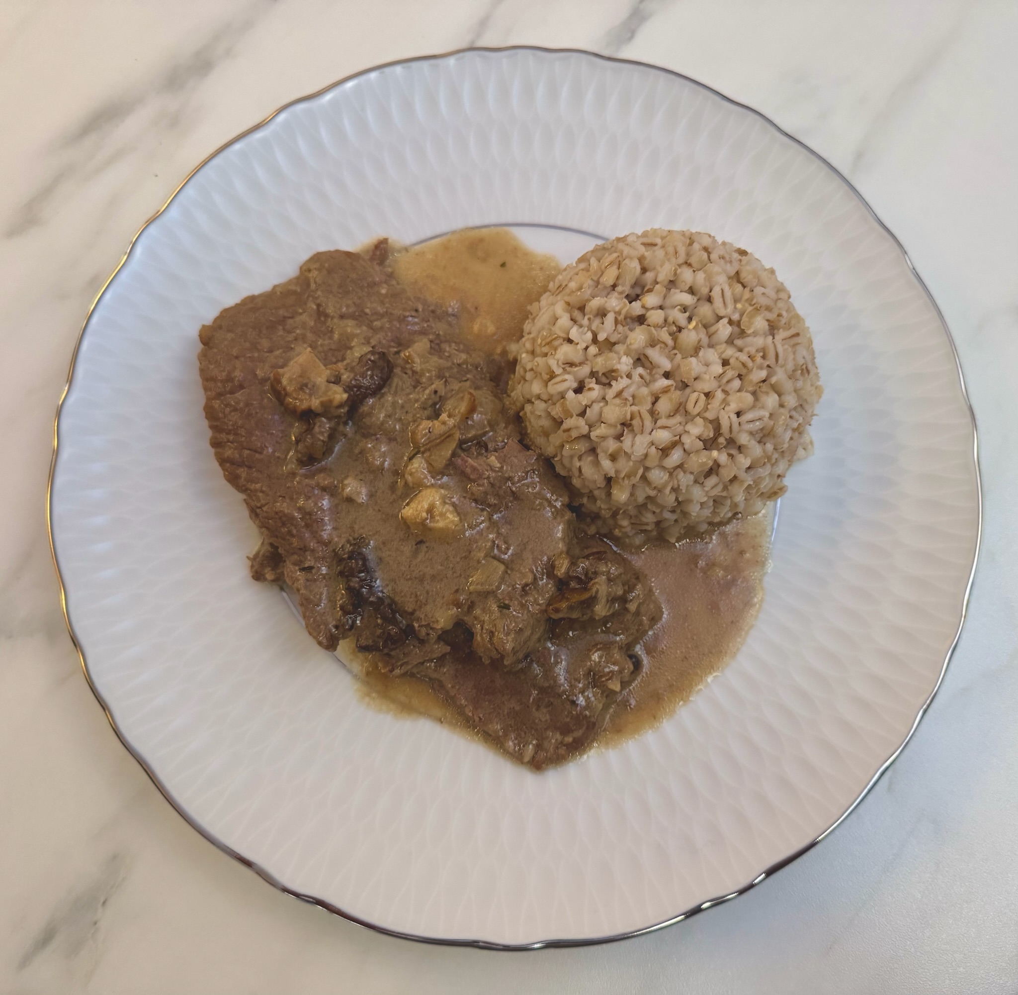 Gdy mięso jest już miękkie a sos jeszcze nie jest gęsty, możemy go oprószyć łyżeczką mąki i zagotować. Na koniec doprawić potrawę solą i świeżo mielonym pieprzem.