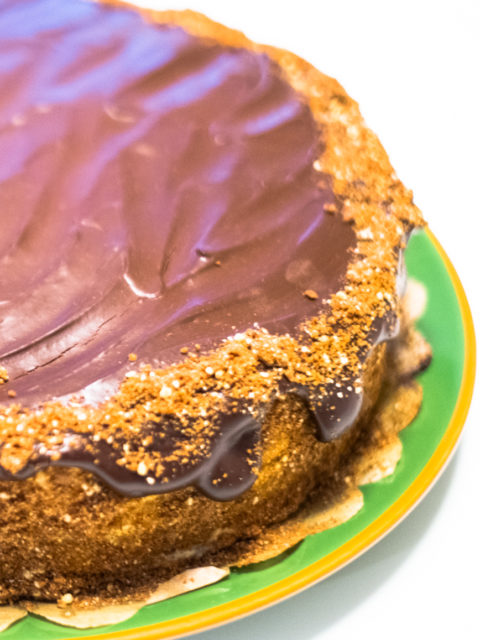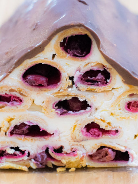 Cienkie blaty z miodowo-czekoladowego ciasta zostały przełożone kremem śmietankowo-waniliowym. Na wierzchu polewa…