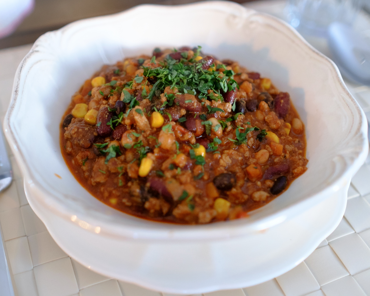 Mielona wołowina, kukurydza , fasola, pomidory i ostre chili. Kmin i oregano sprawiają, że potrawa pachnie obłędnie. Podajemy z ryżem lub tortillą . Danie możemy wzbogacić kleksem kwaśnej śmietany lub jogurtu.