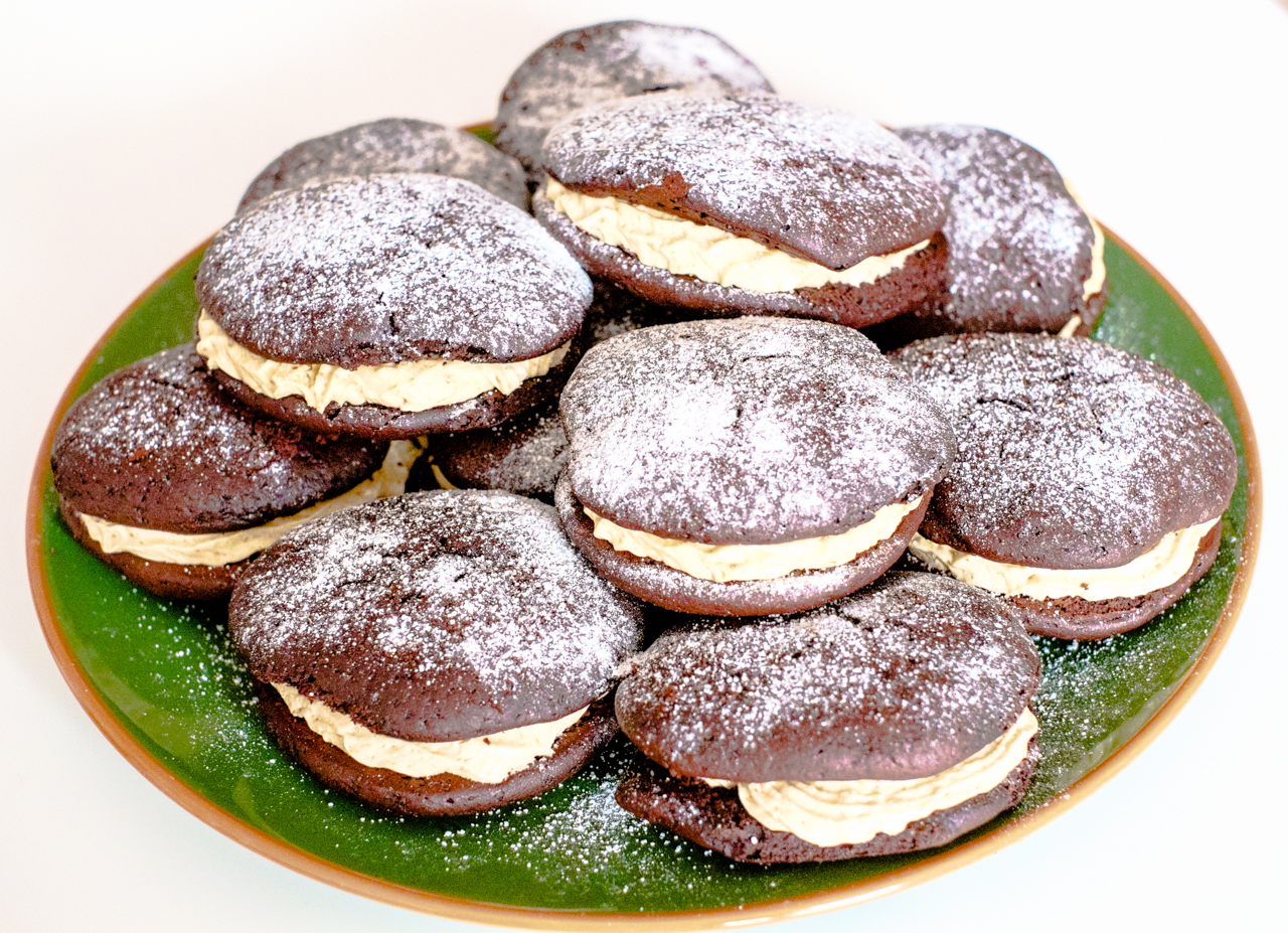 Przepis na te ciastka pochodzi ze strony Anny Olson, następczyni Marthy Stewart . Ciastka whoopie pie są bardzo popularne w USA . Wcale się nie dziwię. Mocno czekoladowe ciasto przełożone jest w tej wersji kremem z masła orzechowego. Nie tylko dzieciaki będą je uwielbiać.