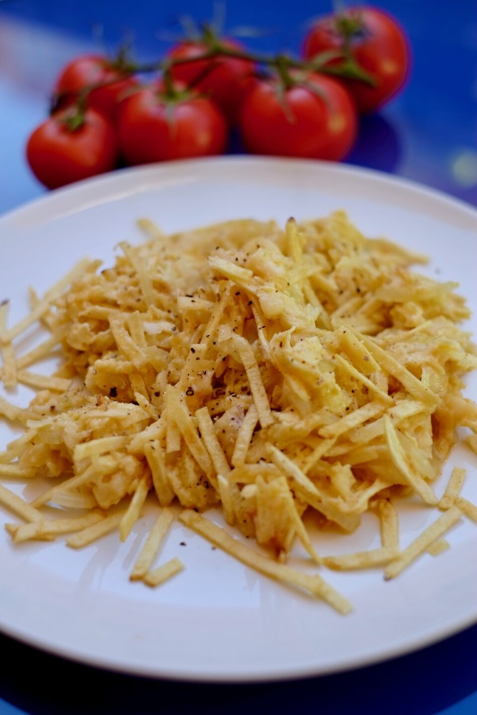 Jest to bardzo sycąca potrawa. Dodatek warzywny na pewno sprawi, że stanie się ona „lżejsza”. Ja podałem ją z pomidorami skropionym tylko oliwą.
