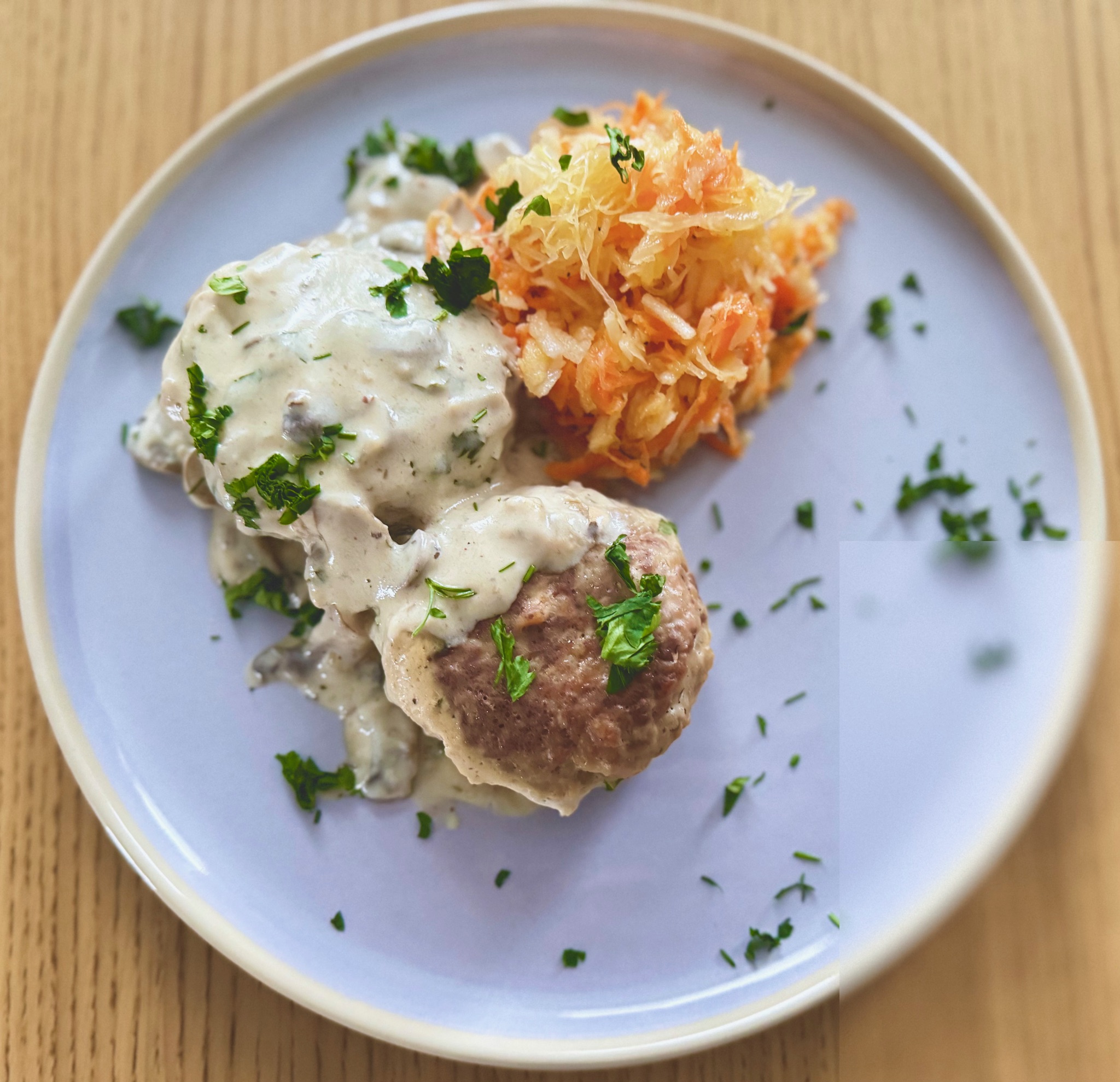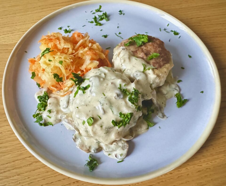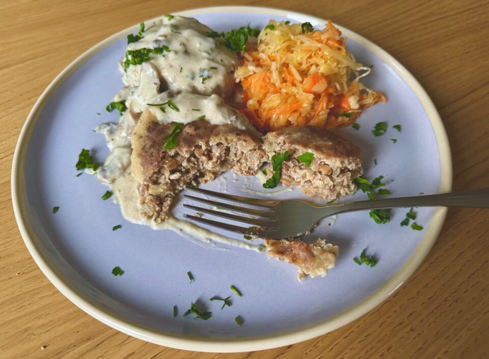 Poniższy przepis znalazłem w starym zeszycie mojej mamy. Jest on bardzo podobny do przepisów z kuchni ukraińskiej lub białoruskiej ( chociaż tam najczęściej widziałem takie kotlety przygotowywane w sosie pomidorowym). Jedyną zmianą jaką zrobiłem to zastąpienie sosu grzybowego z suszonych grzybów sosem pieczarkowym.