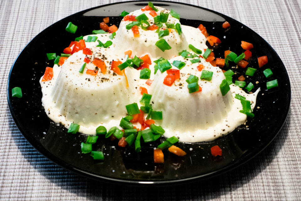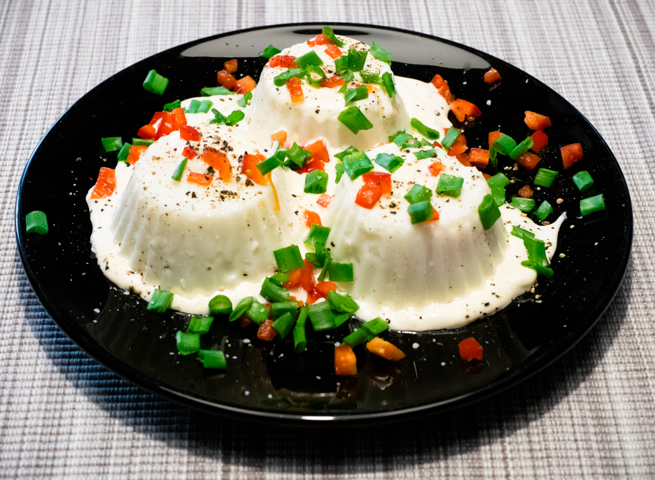 Jajka wybijamy do silikonowych foremek wcześniej umieszczonych w naczyniu do zapiekania . W jedną foremkę bez problemu zmieści się jedno jajko. Piekarnik nagrzewamy do 180 stopni C . Do naczynia z foremkami wlewamy gorącą wodę ( do połowy foremek) i umieszczamy go w rozgrzanym piekarniku. Pieczemy około 15 minut ( aż białko się zetnie). Jogurt mieszamy z majonezem i polewamy przestudzone i wyciągnięte z foremek jajka . Posypujemy zieloną dymką , papryką i świeżo mielonym pieprzem.