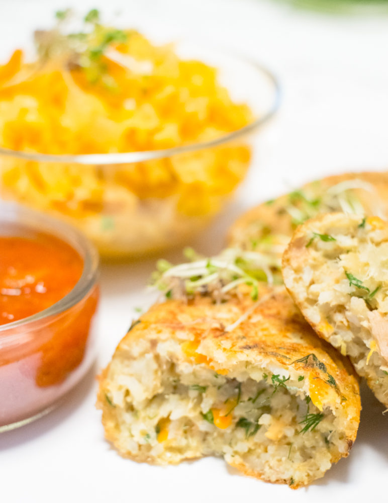 Pomysł na te kotleciki znalazłem przeglądając internet. W orginalnym przepisie kotleciki były z sardynkami z puszki.  Połączenie ugotowanego ryżu, tuńczyka, koperku , cebulki i marchewki dało wspaniały efekt smakowy.  Podane z ostrym , pomidorowym sosem i surówką z kiszonej kapusty są wspaniałym daniem obiadowym. Uwaga! Na zimno są równie pyszne :).