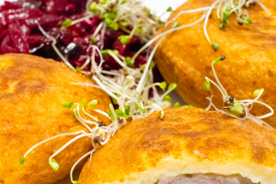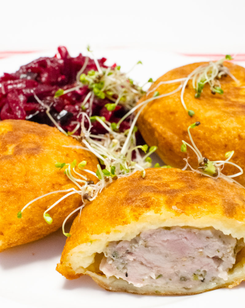 Regionalna potrawa z Mazur i Warmii. Puszyste ciasto z gotowanych ziemniaków , a w środku mięsne nadzienie. Kotleciki usmażone zostały na oleju i podane z sałatką z buraczków , orzechów włoskich i wędzonej , suszonej śliwki.