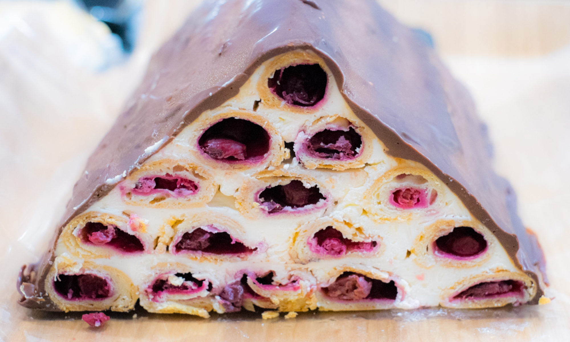 Ciasto jest pracochłonne ale smak wynagradza wszystko. Cienkie roladki z kruchego ciasta nadziane zostały wiśniami. Po upieczeniu złożone zostały kremem z kwaśnej śmietany w kształt trójkątnej pryzmy i oblane czekoladą. Ciasto nie jest przesadnie słodkie . Nadaje się na każdą uroczystość.