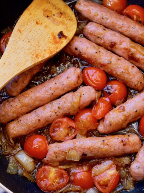 Kiełbaski z cebulą i pomidorkami cherry