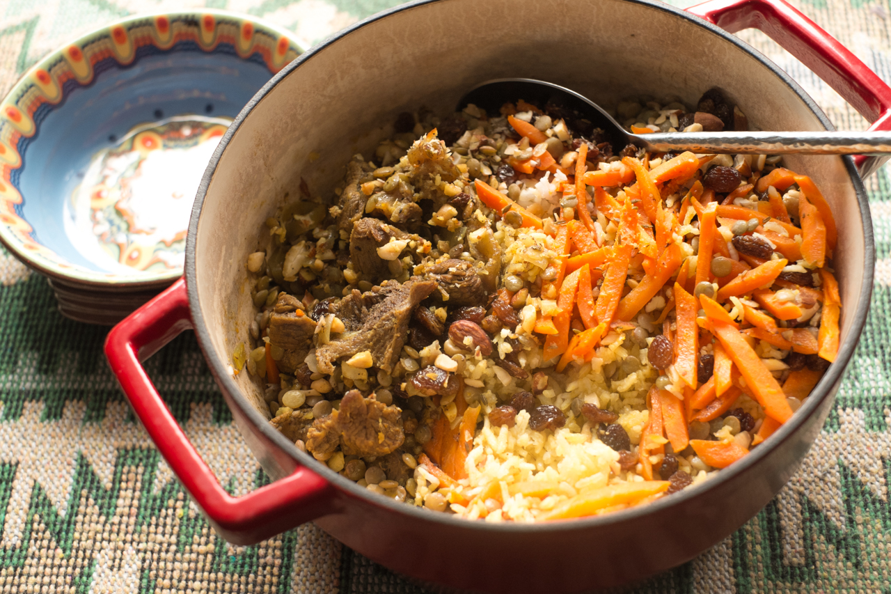 W garnku z dopasowaną pokrywką ( rondel, wysoka patelnia, garnek żeliwny, wok) ułożyć na połowie ryż. Obok ryżu wyłożyć mięso z sosem. Na ryż wyłożyć marchewkę. Na mięso wyłożyć ciecierzycę. Posypać potrawę rodzynkami i pistacjami. Kmin zetrzeć lekko palcami i posypać całą potrawę. Garnek przykryć czystą ściereczką, a na ściereczkę pokrywkę. Gotować na bardzo małym ogniu przez 15 minut, po czym wyłączyć i zostawić na 15-20 minut. Przed serwowaniem pilaw można wymieszać.