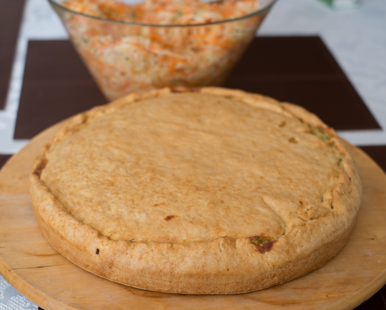Schłodzone ciasto dzielimy na dwie nierówne części ( 2/3 i 1/3). Większą część rozwałkowujemy i wykładamy tortownicę o średnicy 23 cm, tak aby ciasto było też na bokach tortownicy.Na ciasto wkładamy nasze nadzienie i przykrywamy rozwałkowanym krążkiem z mniejszej części. Ciasto , które wystaje ponad nadzienie delikatnie ściągamy na naszą „pokrywkę”. Pieczemy przez około godzinę w temperaturze 180 stopni C.