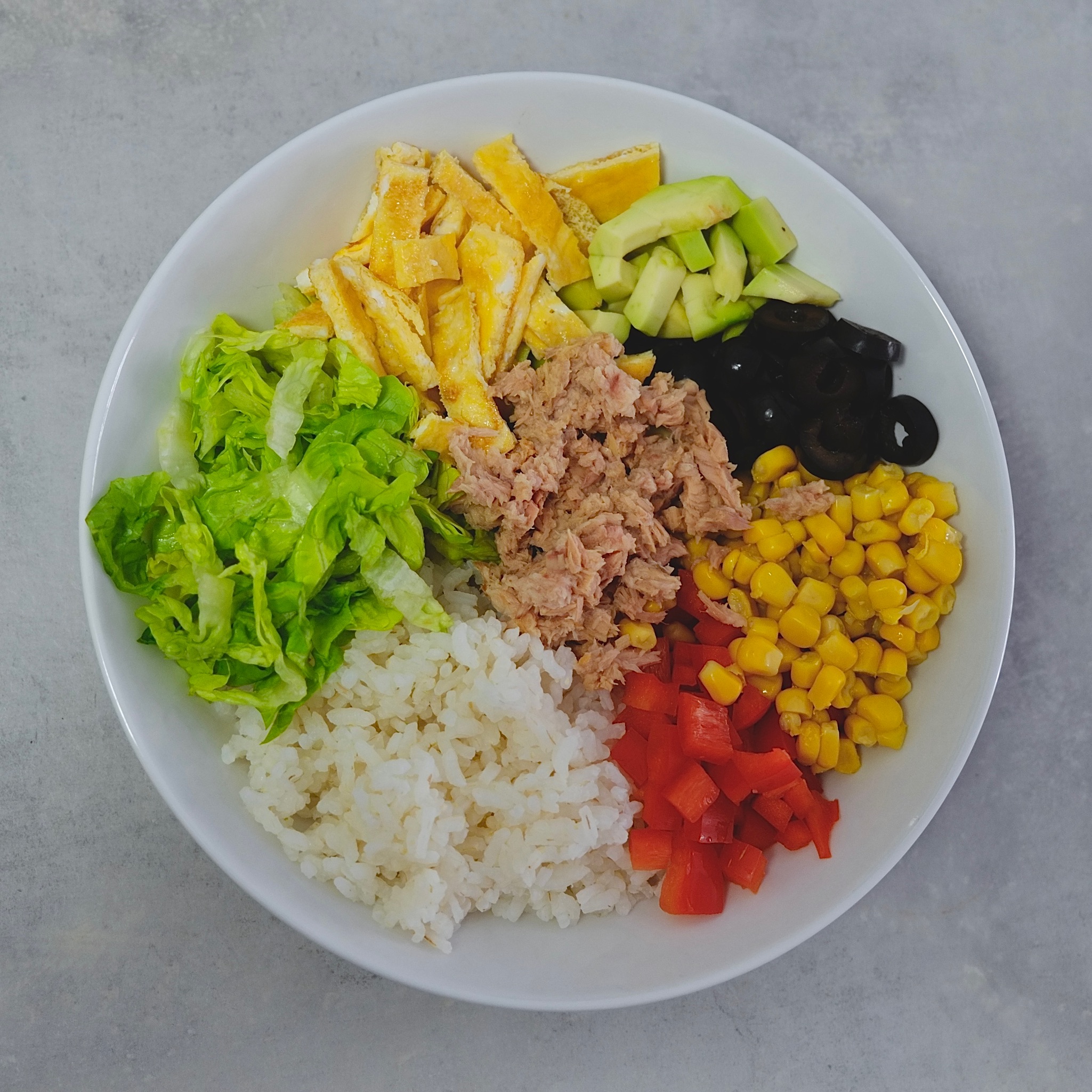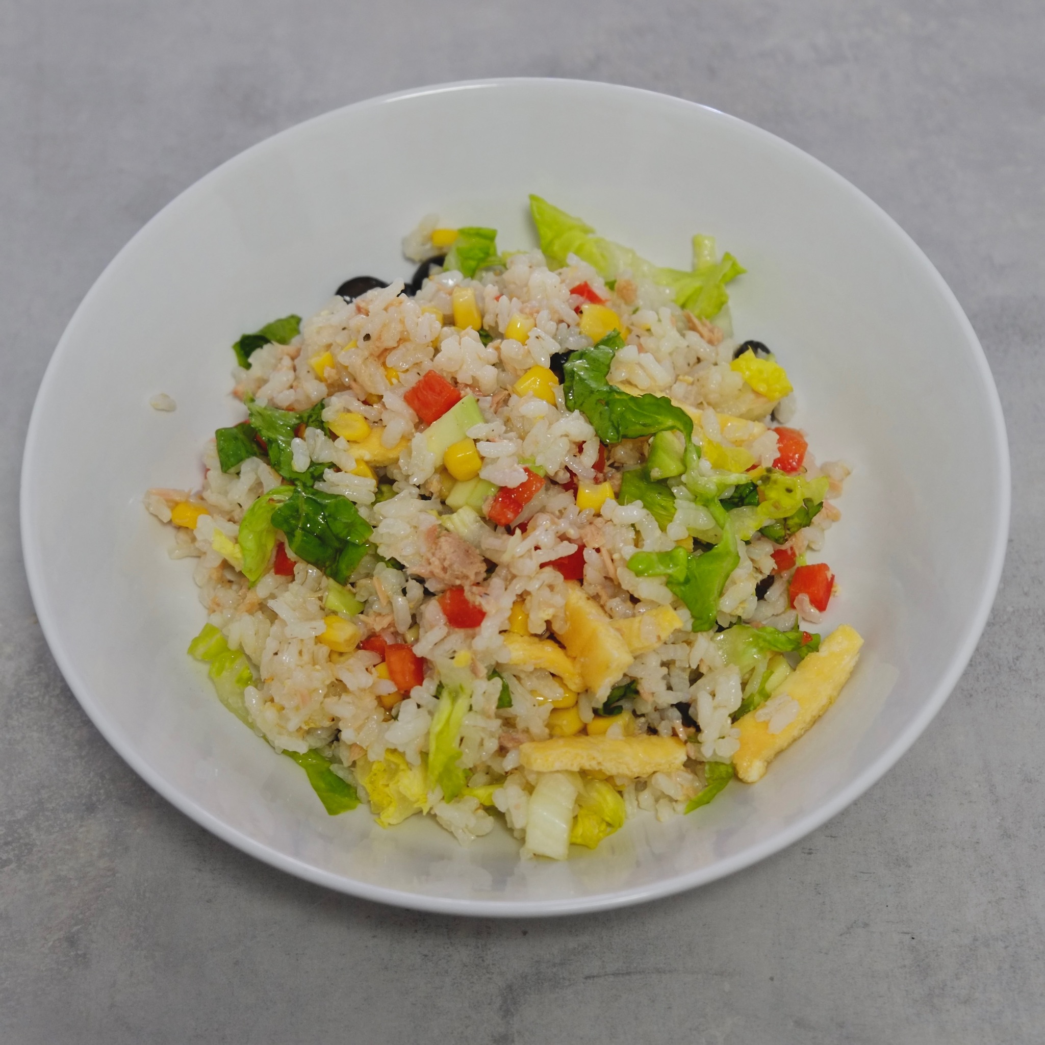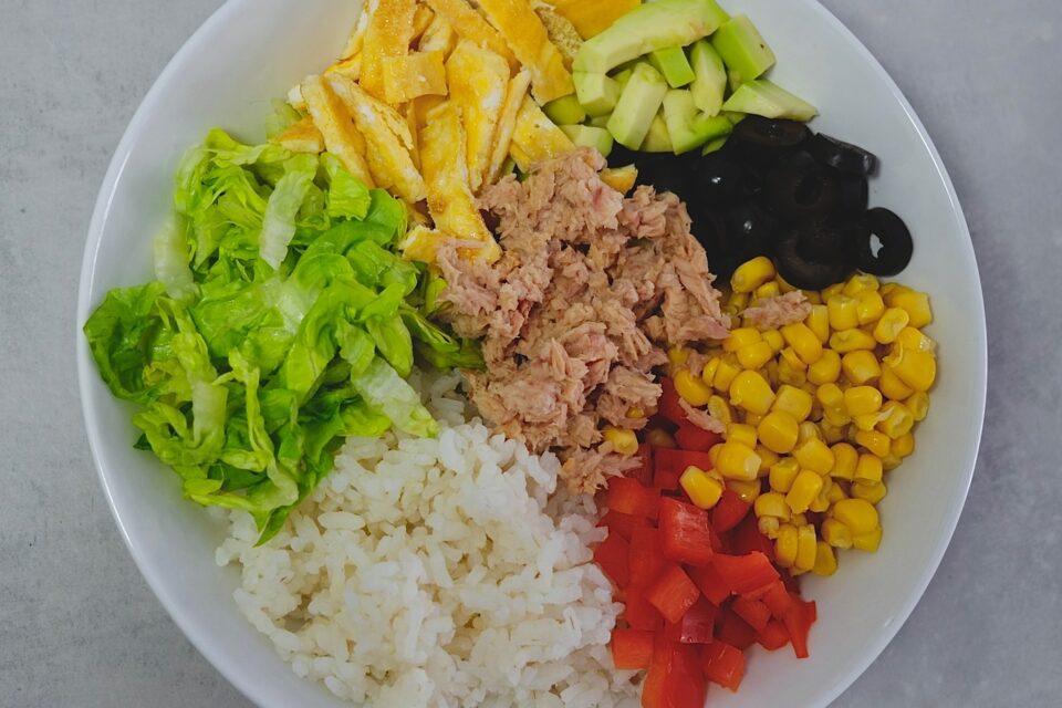 Prosta sałatka z ryżu, tuńczyka, omletu i warzyw
