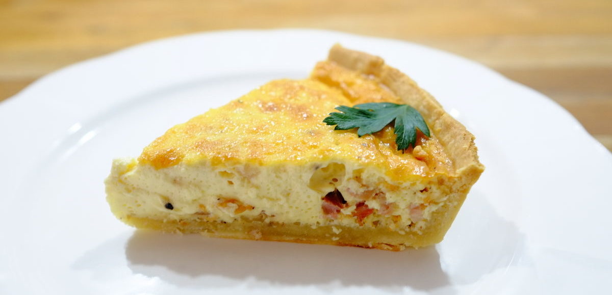 Boczek pokroić w kostkę i podsmażyć ta patelni aby stał się chrupiący . Odsączyć z tłuszczu i wyłożyć na podpieczone ciasto. Jajka wymieszać ze śmietaną , dodać sól  i przyprawy. Wylać na podsmażony boczek. Masło pokroić na kawałki i rozłożyć je w kilku miejscach na masie jajecznej. Pieczemy w temperaturze 190 stopni C przez 25-30 minut , aż nadzienie będzie puszyste i rumiane . Podajemy na ciepło lub zimno .