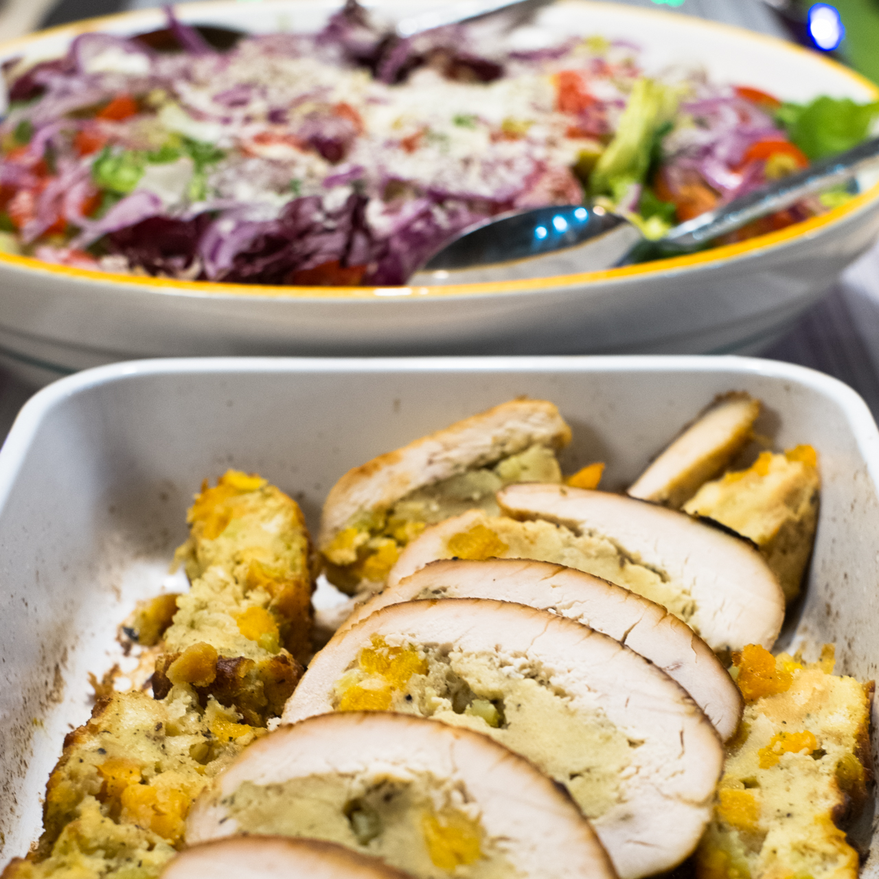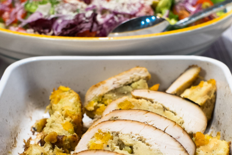 Potrawa zainspirowana została amerykańskimi przepisami na pieczonego indyka. Nadzienie z chleba tostowego, selera naciowego i suszonych moreli idealnie pasuje do delikatnej indyczej piersi. Do tego miska sałaty i pieczone ziemniaki.