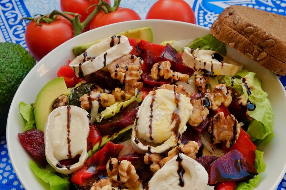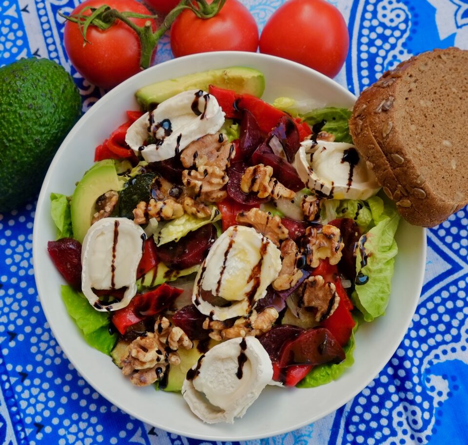 Dzisiaj proponuję pyszną sałatę z buraczkami, kozim serem, awokado i orzechami włoskimi. Oczywiście, to jakie warzywa dodamy do sałaty zależy od tego co lubimy ( lub mamy w lodówce). Orzechy włoskie można zastąpić nerkowcami lub orzechami laskowymi. Roladę kozią można zamienić na ser typu camembert lub brie.