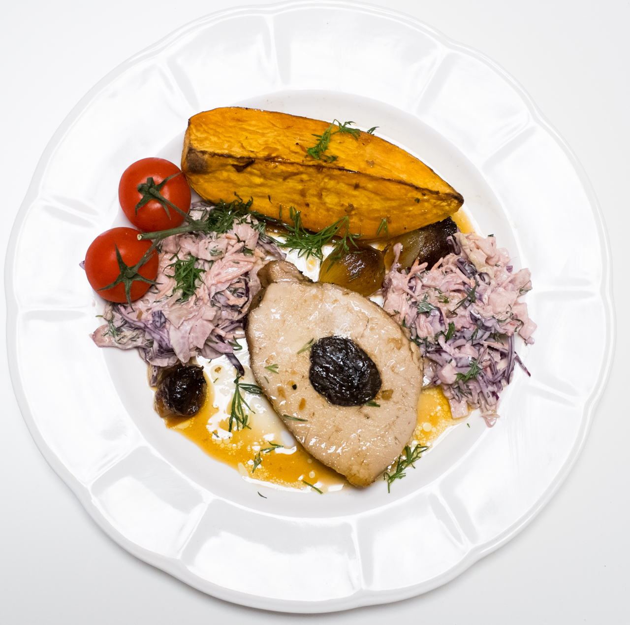 Schab wieprzowy nadziany wędzonymi śliwkami . Plaster soczystego schabu podany z pieczonym batatem i surówką z czerwonej kapusty, marchewki, selera i jabłka.