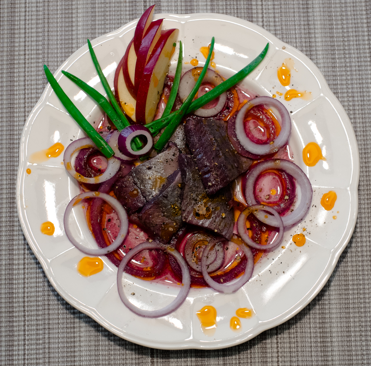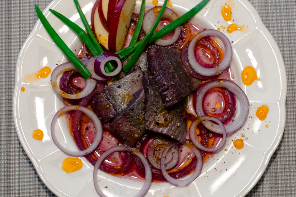 Filety śledziowe marynowane w korzennej marynacie z czerwonego wina.