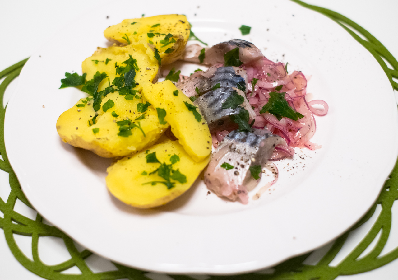 Świeża makrela zasolona domowym sposobem w solance przygotowanej na wywarze z łusek cebuli . Oczywiście w solance oprócz soli jest pełno przypraw korzennych.