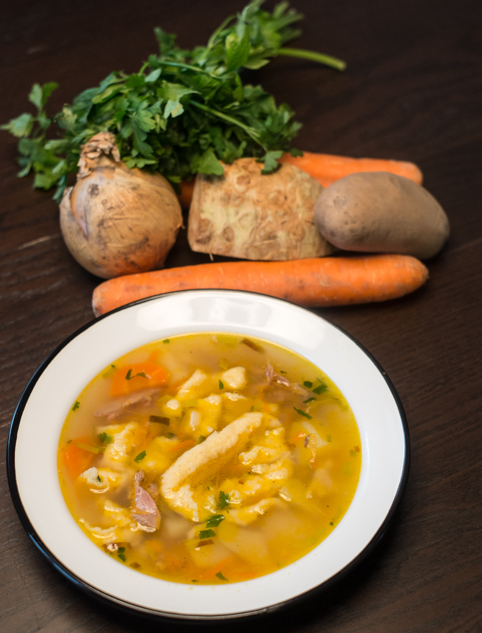Jajka roztrzepujemy ze szczyptą soli i dodajemy mąkę. Mieszamy aż powstanie gęste , jednolite ciasto . Odstawiamy na 15 minut. Rosół zagotowujemy i wrzucamy do niego pokrojone w kostkę ziemniaki. Gotujemy aż ziemniaki będą prawie miękkie. W czasie jak gotują nam się ziemniaki rozgrzewamy olej na patelni i podsmażamy na nim pokrojoną w kostkę cebulę i startą na tarce o dużych oczkach marchew. Smażymy do miękkości warzyw i dodajemy do garnka z zupą. Maczaną w gorącej zupie łyżką nabieramy ciasto i wrzucamy na wrzątek. Gdy wszystkie kluseczki są już w garnku mieszamy je lekko, dodajemy listek laurowy i gotujemy na małym ogniu aż kluseczki będą w środku ugotowane (sprawdzamy wyjmując i krojąc jednego klucha – czas gotowania może być różny , zależy jakiej wielkości kluski formowaliśmy ). Zupę doprawiamy solą, pieprzem i posypujemy zielenią.